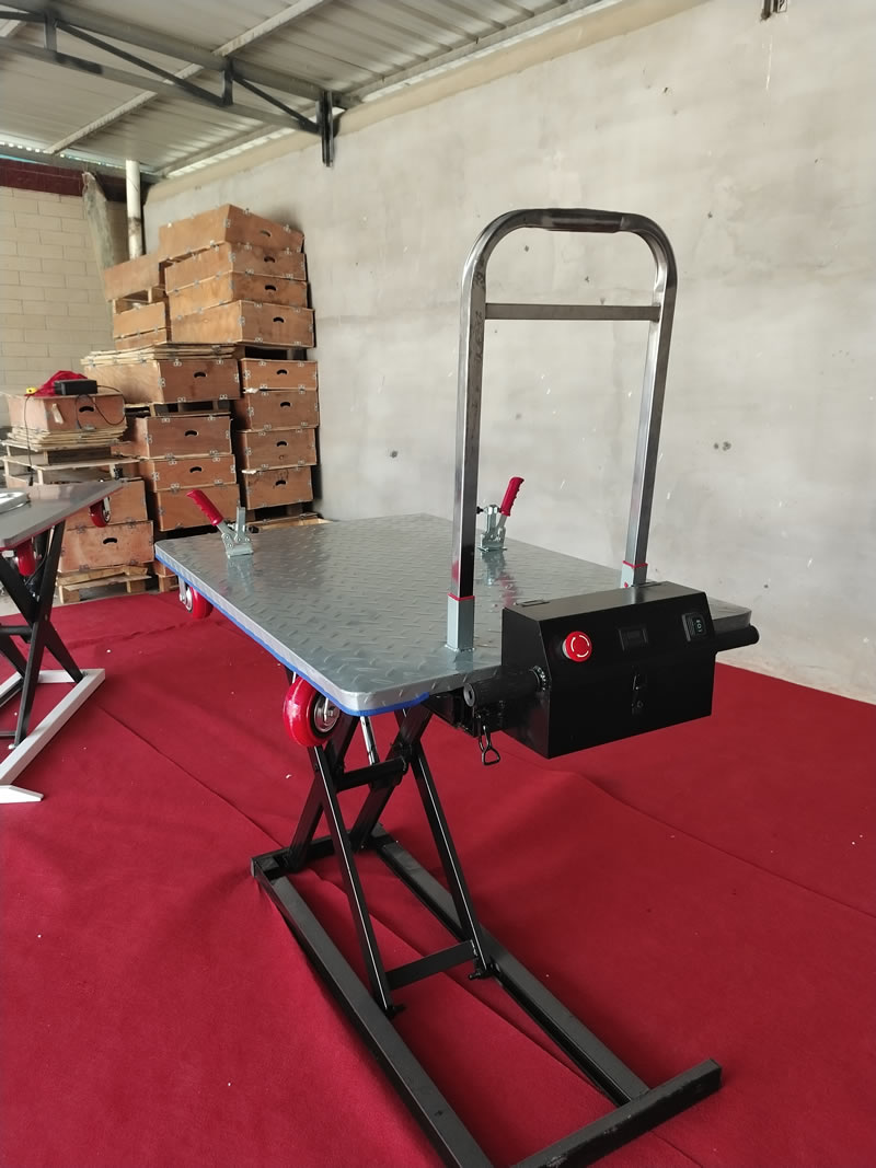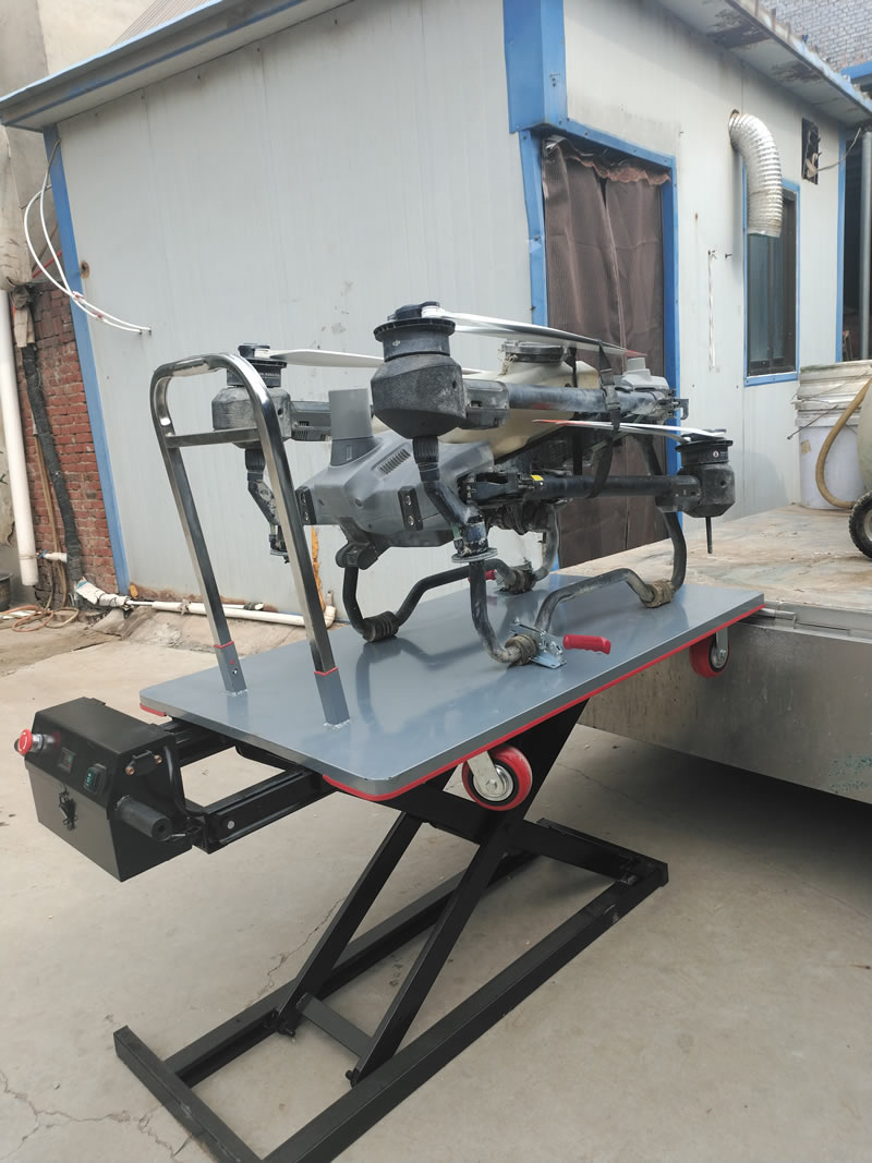 这是一款随车电动升降转运车,针对植保无人机如大疆T60无人机,极飞p150无人机的搬运和转场,锂电动力,一键升降,一个人操作上下车,也可以直接做无人机的起落平台,有了它就不用两个人抬无人机了,省时省力又省人工!出门植保作业一人轻松完成!
